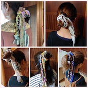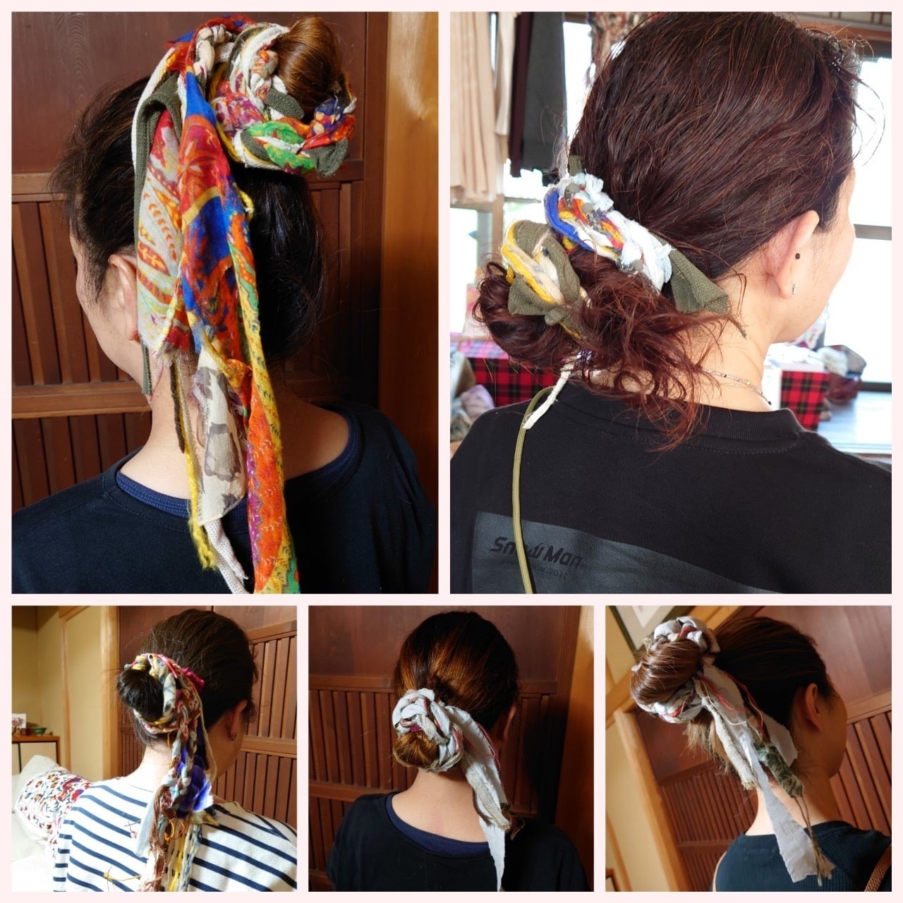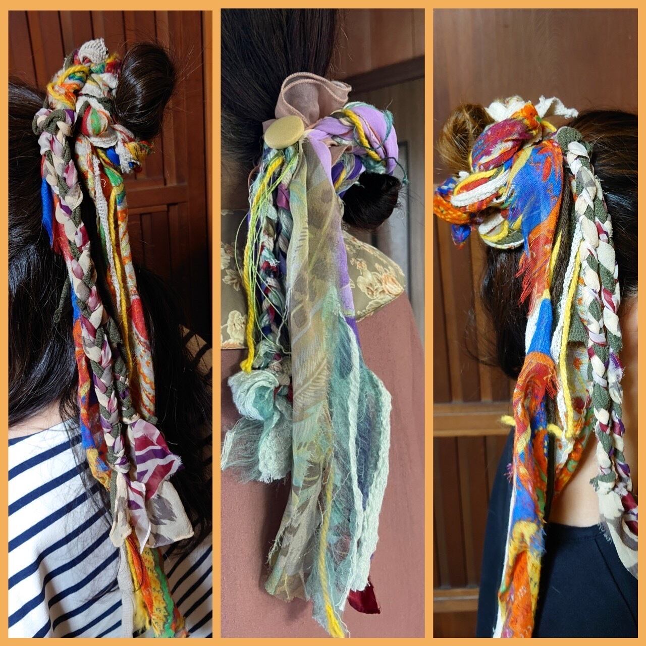 染め上げた布や紐、スカーフやお気に入りだけど使えなくなった服やサリーの布を裂いて色々な色柄を組み合わせて編み上げました。シュシュについた飾りの紐は、そのまま伸ばしてドレッドロングヘア風やくるくる巻いてお洒落なターバン風にできます。