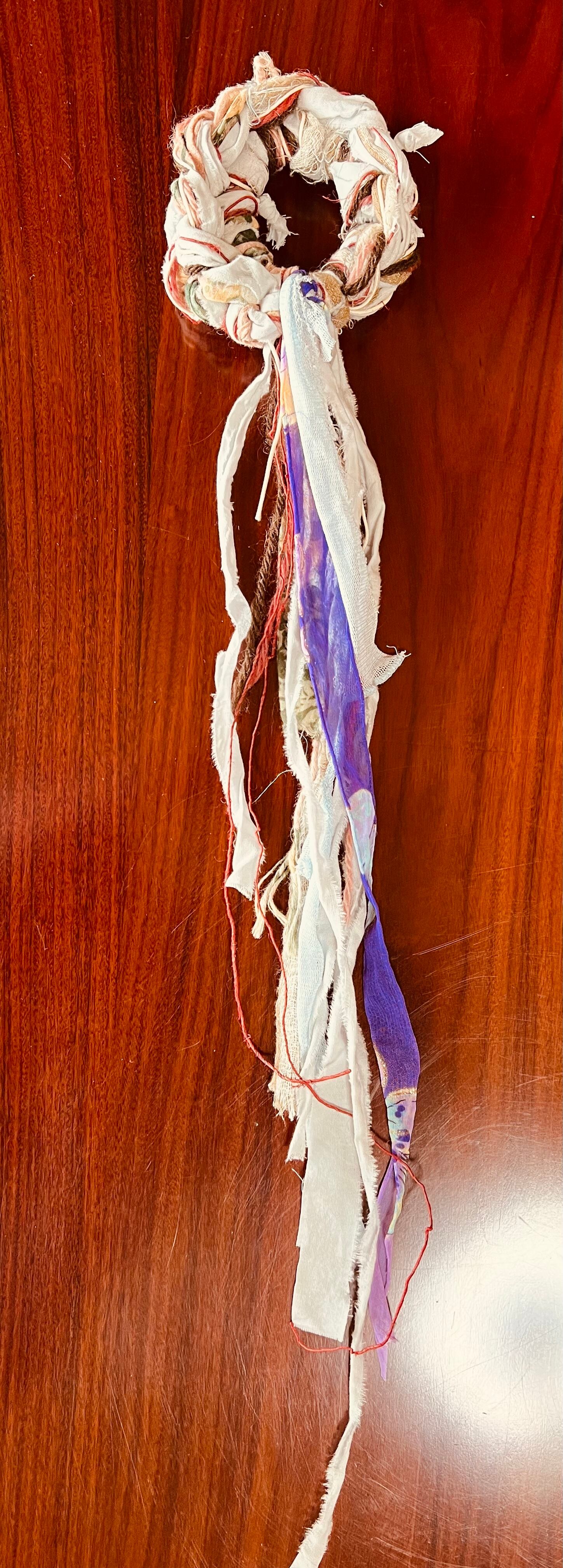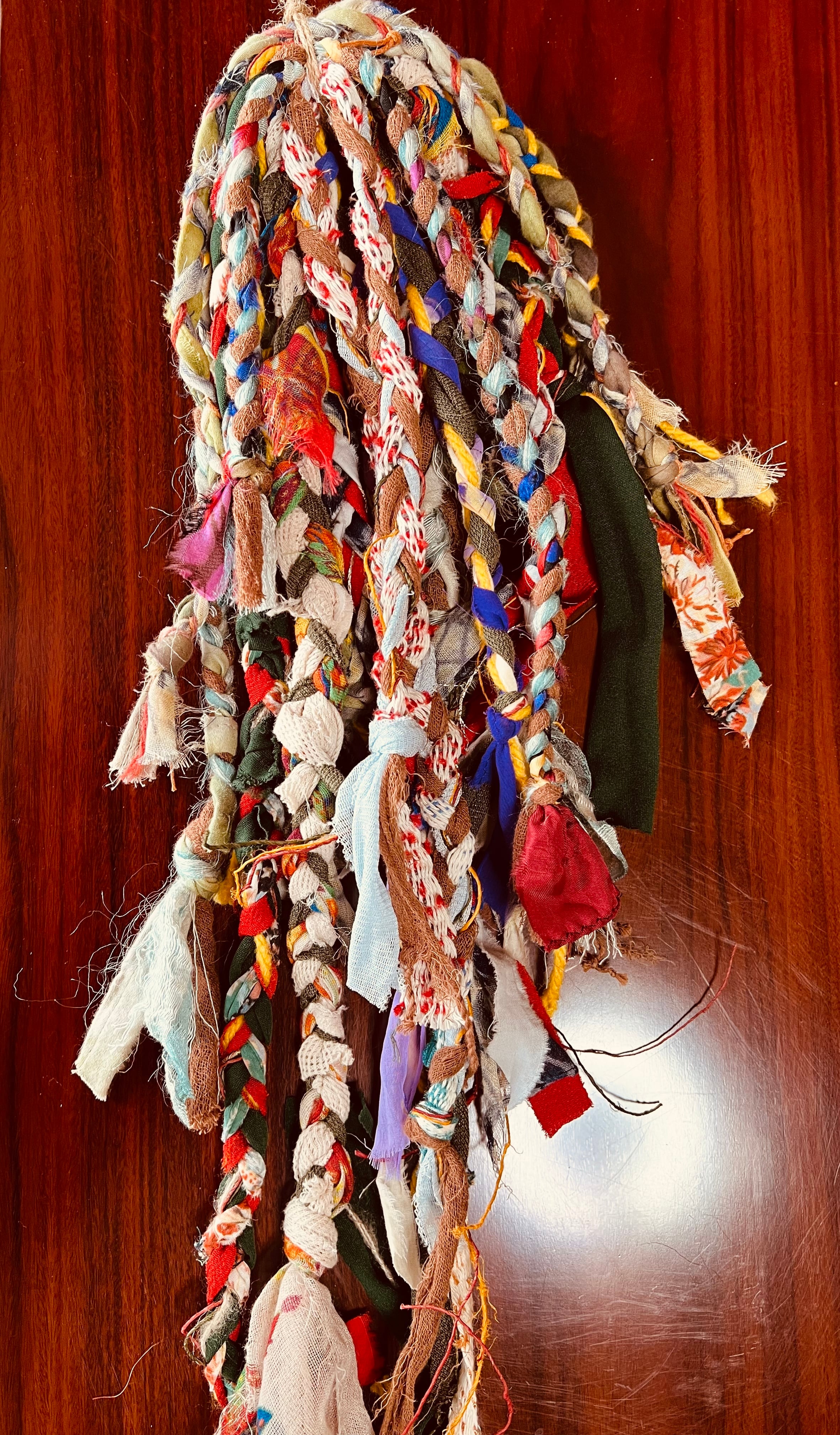 染め上げた布や紐、スカーフやお気に入りだけど使えなくなった服やサリーの布を裂いて色々な色柄を組み合わせて編み上げました。シュシュについた飾りの紐は、そのまま伸ばしてドレッドロングヘア風やくるくる巻いてお洒落なターバン風にできます。