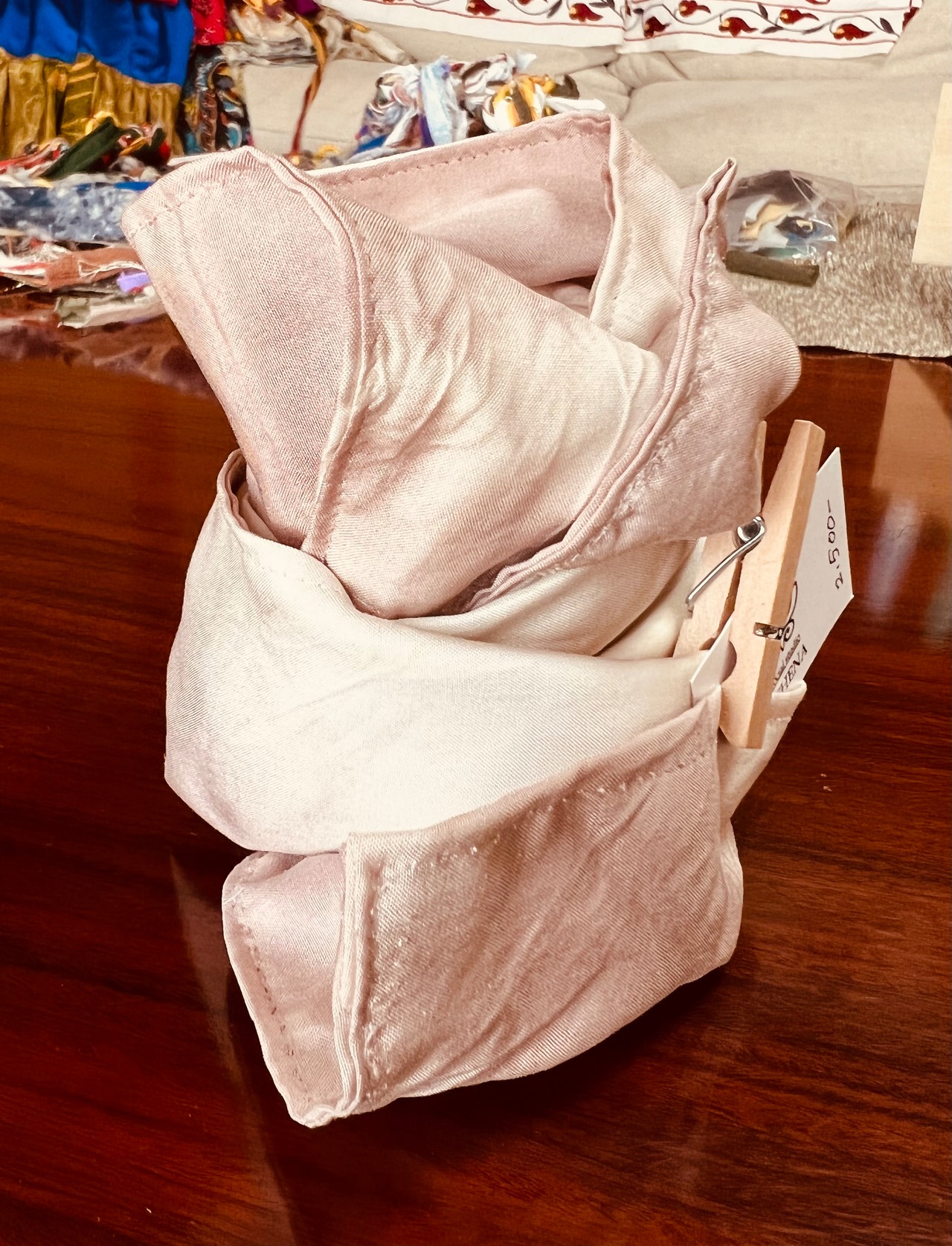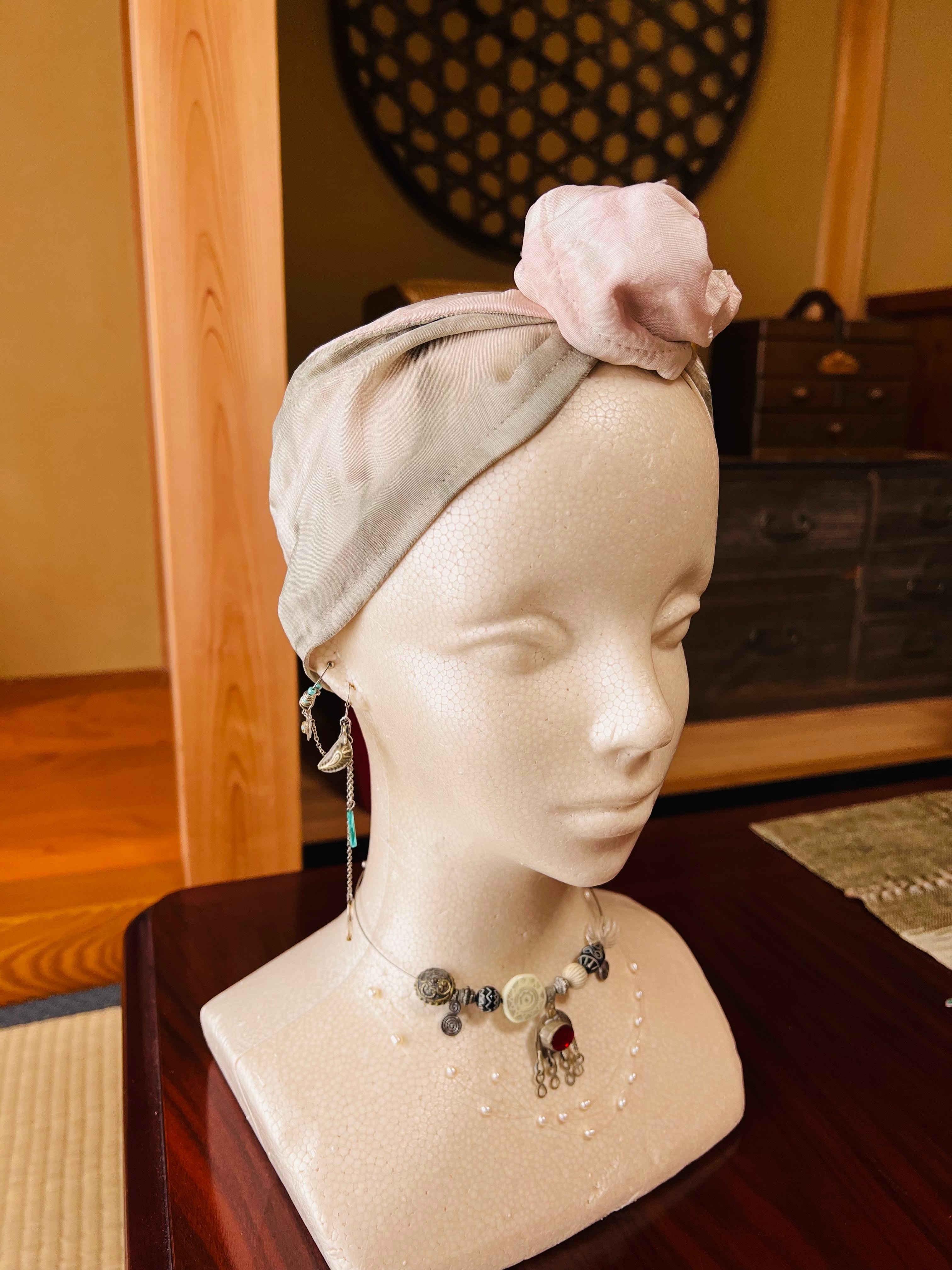 シルク生地の紫蘇&サクラ+ウコンのリバーシブル染めターバンです。
