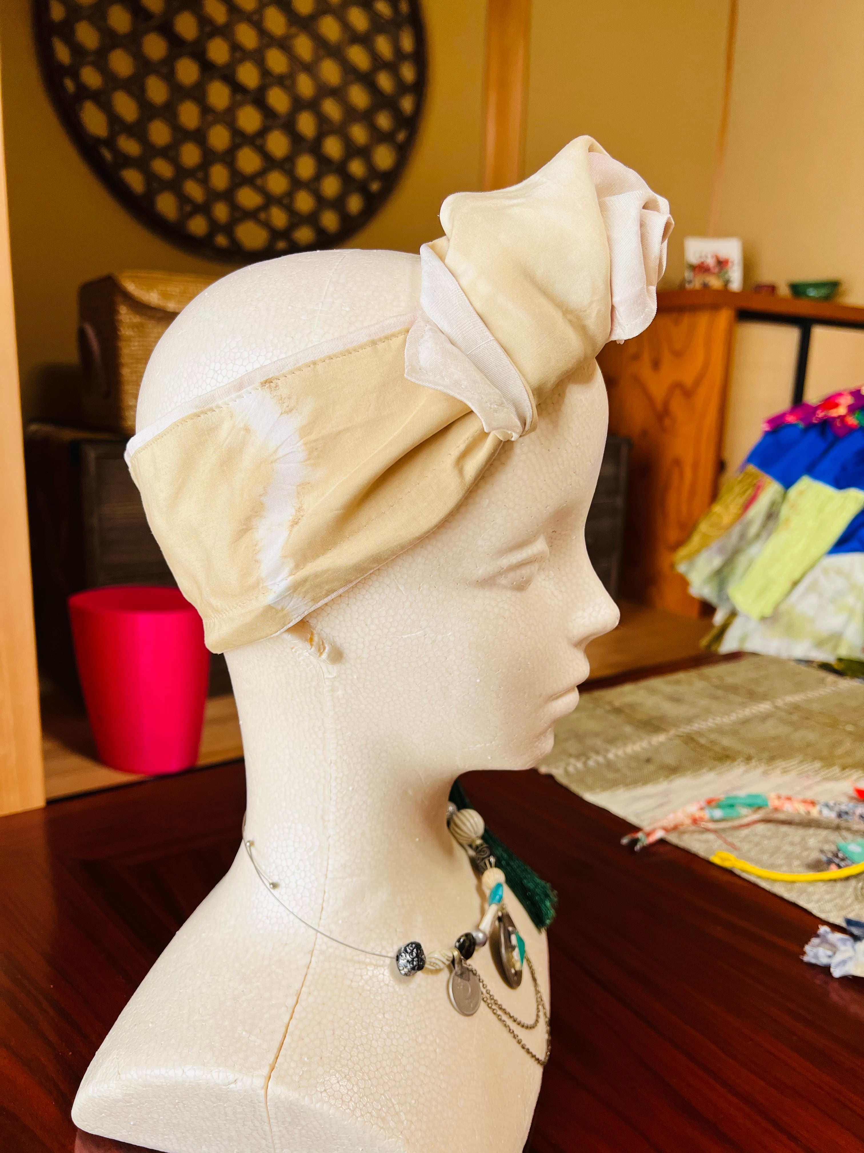 シルク生地のフキ+ウコン染めのリバーシブルターバンです。