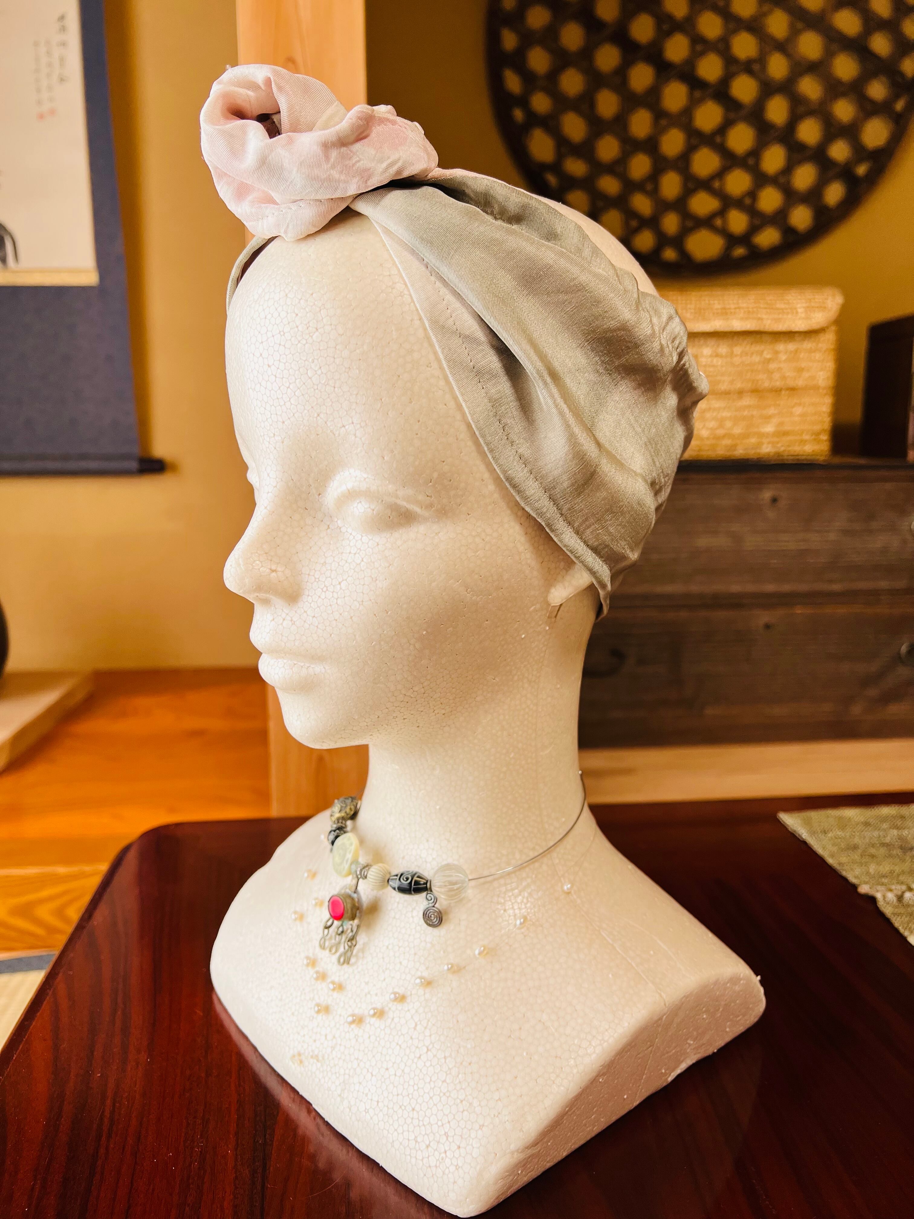 シルク生地の紫蘇&サクラ+フキ染めリバーシブルターバンです。