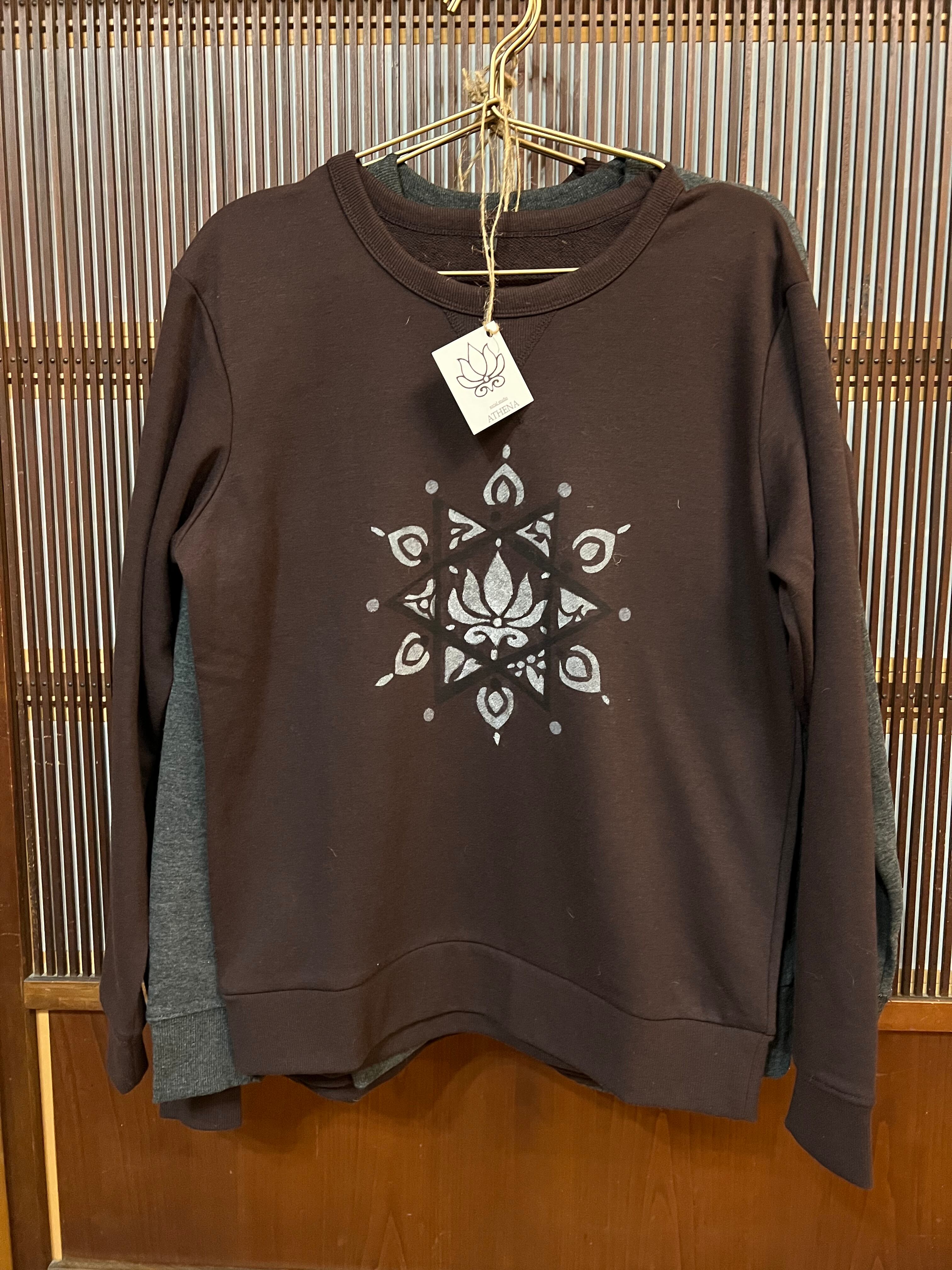 アテナロゴマークを曼荼羅模様にデザインしたトレーナー。ユニセックスサイズMクロMグレーL濃いめのグレーXL濃いめのグレー。